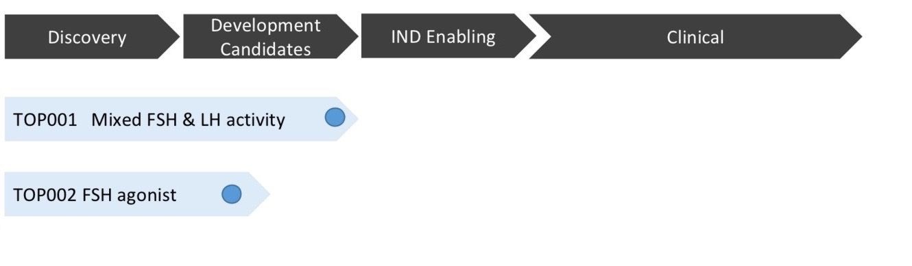 TOP001 has both FSH and LH activity at a ratio of 5:1. TOP002 has predominantly FSH activity. TOP001 and TOP002 are being developed for ovulation induction and in vitro fertilization cycles in women and for non-obstructive mild-moderate-severe oligospermia in men.