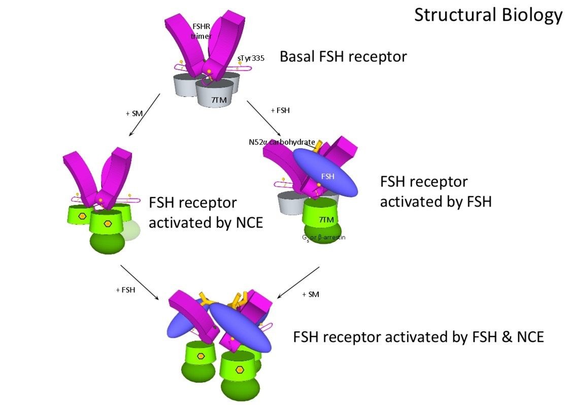 FSH (blue; 33kD) and the inactive FSH receptor (magenta & gray; 75 kD), are both large proteins. TocopheRx has successfully developed innovative small molecules (gold) that directly activate the transmembrane domain (green). TocopheRx allosteric agonists (TOPs) enhance the response of the FSH receptor when a small amount of FSH is present, or act as a receptor agonist in the absence of endogenous FSH.